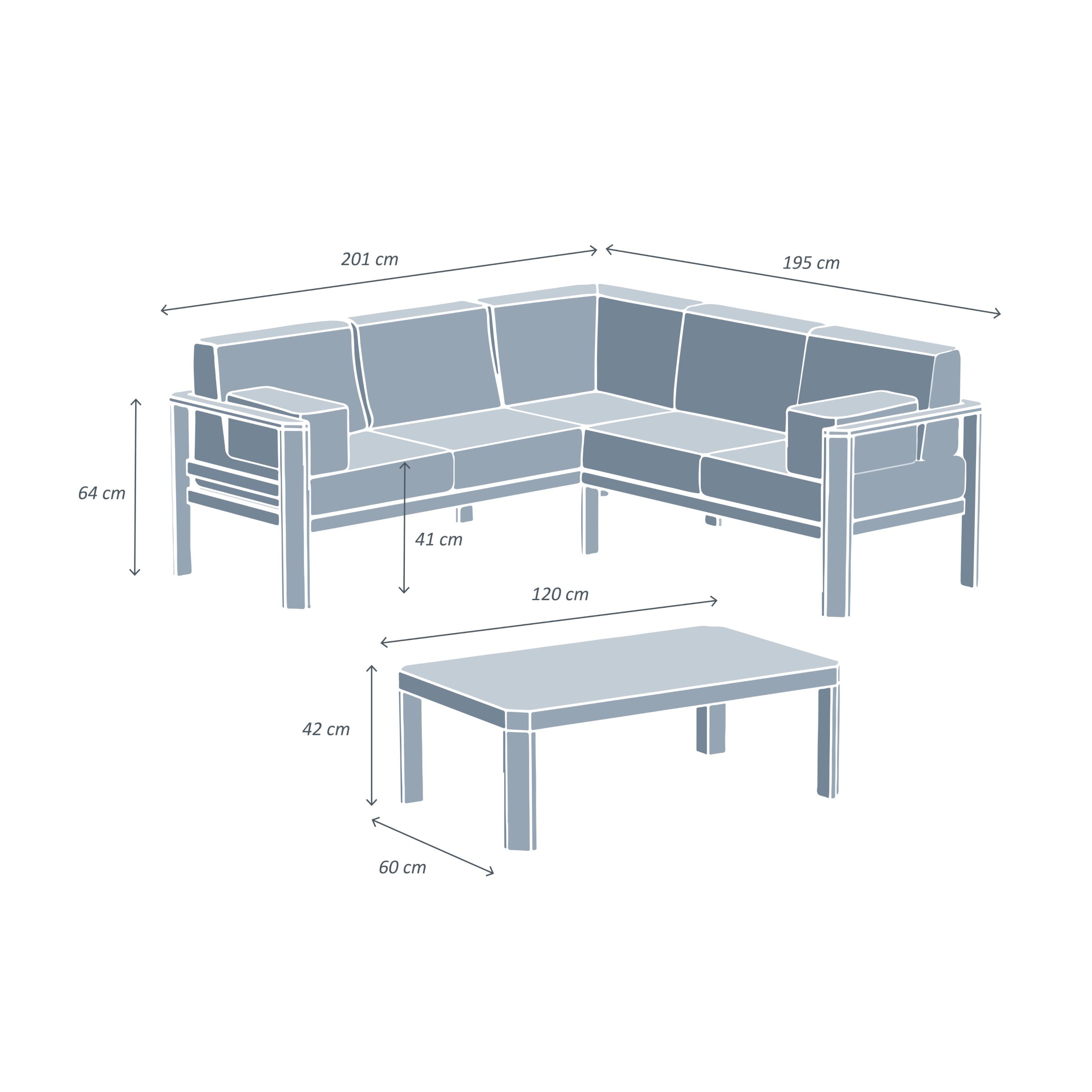 Dimensions: - Canapé trois places M : longueur 201 cm x profondeur 74 cm x hauteur 64 cm. - Canapé trois places S : longueur 195 cm x profondeur 74 cm x hauteur 64 cm. - Une table : longueur 120 cm x profondeur 60 cm x hauteur 42 cm. - Hauteur d'assise : 41 cm et 31 cm sans coussin. - Coussin assise : longueur 62.5 x profondeur 68 x hauteur 10 cm.