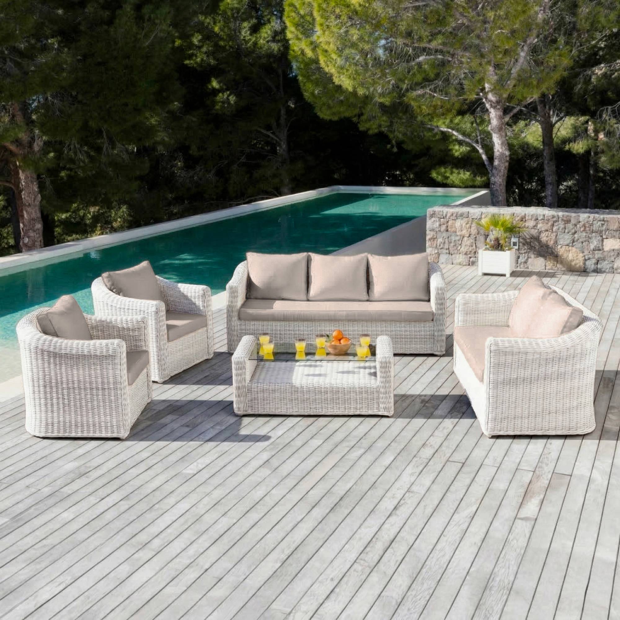 Il comprend : un canapé 3 places, un canapé 2 places, deux fauteuils avec accoudoirs et une table basse. Tous les coussins sont inclus.
