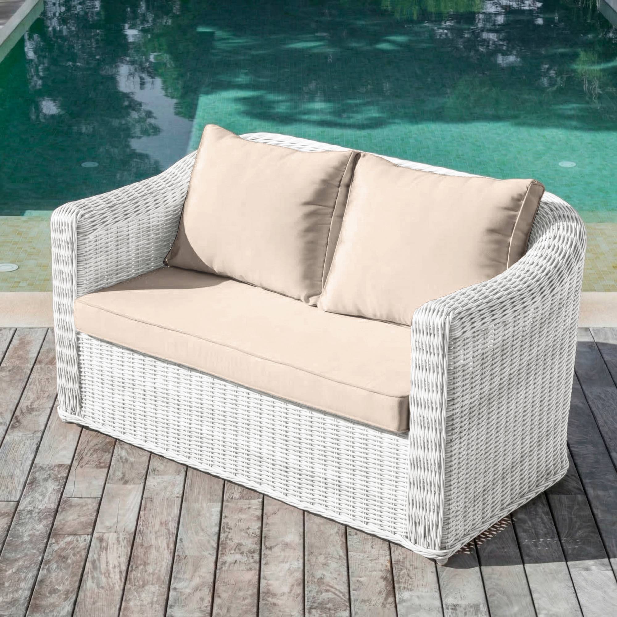 Couleur : résine blanche et coussins taupe.