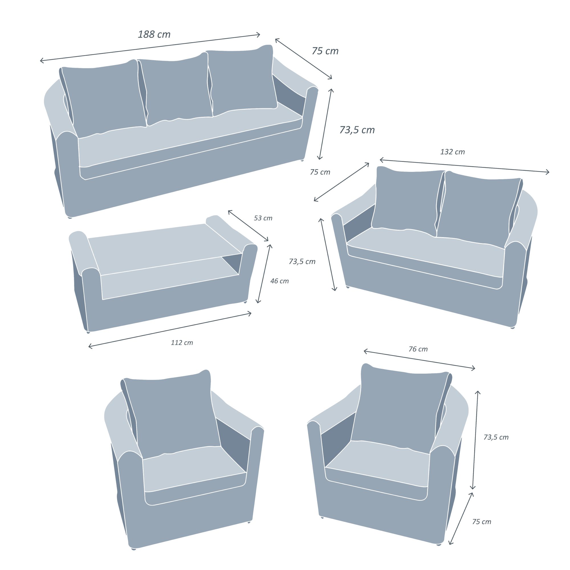 Dimensions : - Fauteuil avec accoudoirs : longueur 77 cm x profondeur 75 cm x hauteur 75 cm. - Canapé 2 places : longueur 133 cm x profondeur 75 cm x hauteur 75 cm. - Canapé 3 places : longueur 189 cm x profondeur 75 cm x hauteur 75 cm. - Table basse : longueur 112 cm x profondeur 53 cm x hauteur 48 cm. - Hauteur d'assise : 40 cm avec coussin et 30 sans coussin. - Hauteur de dossier à partir de l'assise : 23 cm. - Hauteur d'accoudoir : 63 cm. - Profondeur d'assise : 59 cm sans coussin et 42 cm environ avec coussin. - Pieds : hauteur 2 cm. - Accoudoir : largeur 12 cm. - Coussin d'assise pour fauteuil : longueur 51 x largeur 59 x épaisseur 10 cm. - Coussin d'assise pour canapé 2 places : longueur 108 x largeur 59 x épaisseur 10 cm. - Coussin d'assise pour canapé 3 places : longueur 162 x largeur 59 x épaisseur 10 cm. - Coussins de dossier : longueur 55 x largeur 49 x hauteur 22 cm.