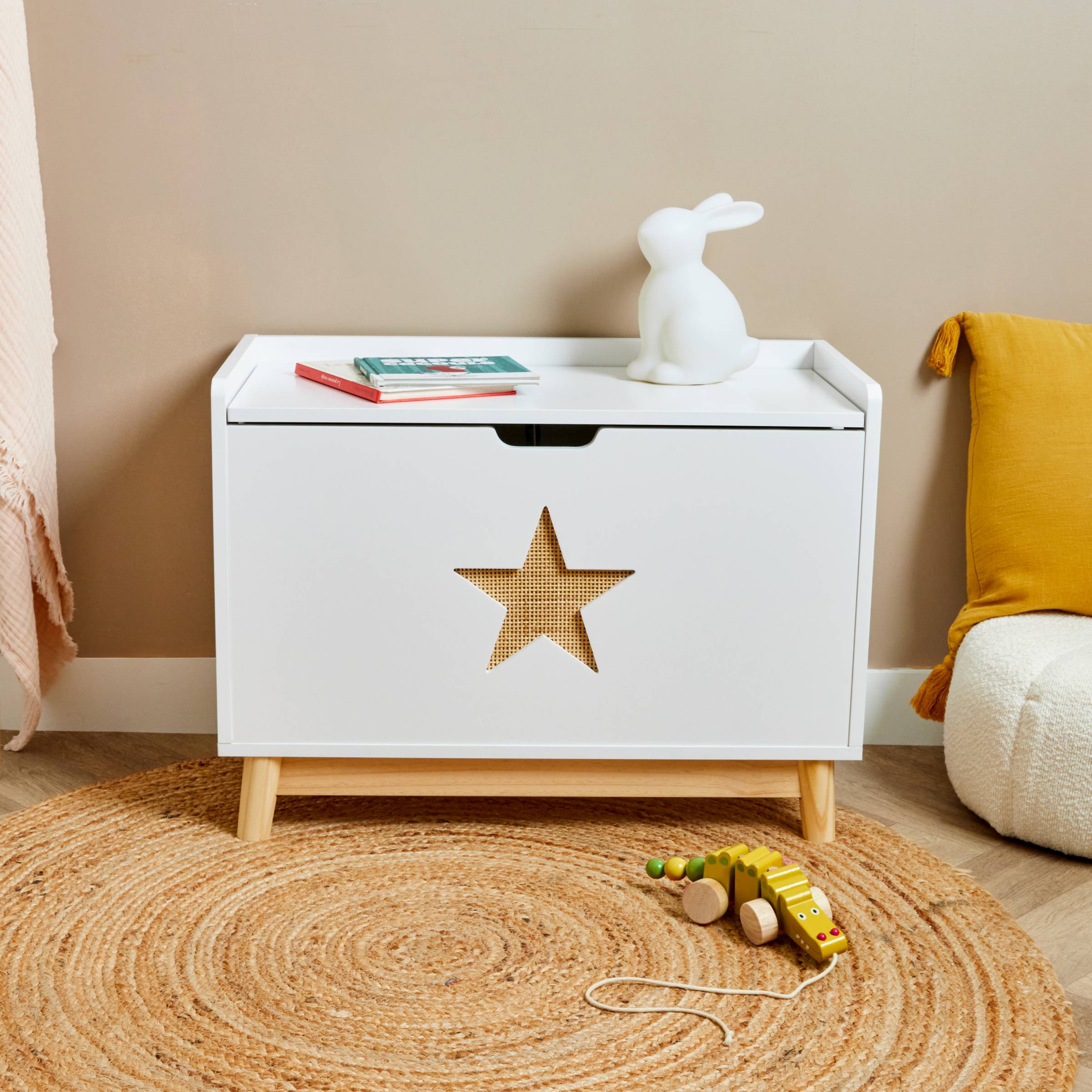 Ce coffre à jouets en bois, de la collection Eminza Kids, offre un espace de rangement pratique et sécurisé pour les jouets de votre enfant. Avec sa structure robuste et son design simple, il s'intègre facilement dans une chambre ou une salle de jeux, tout en permettant de garder l’espace bien ordonné.