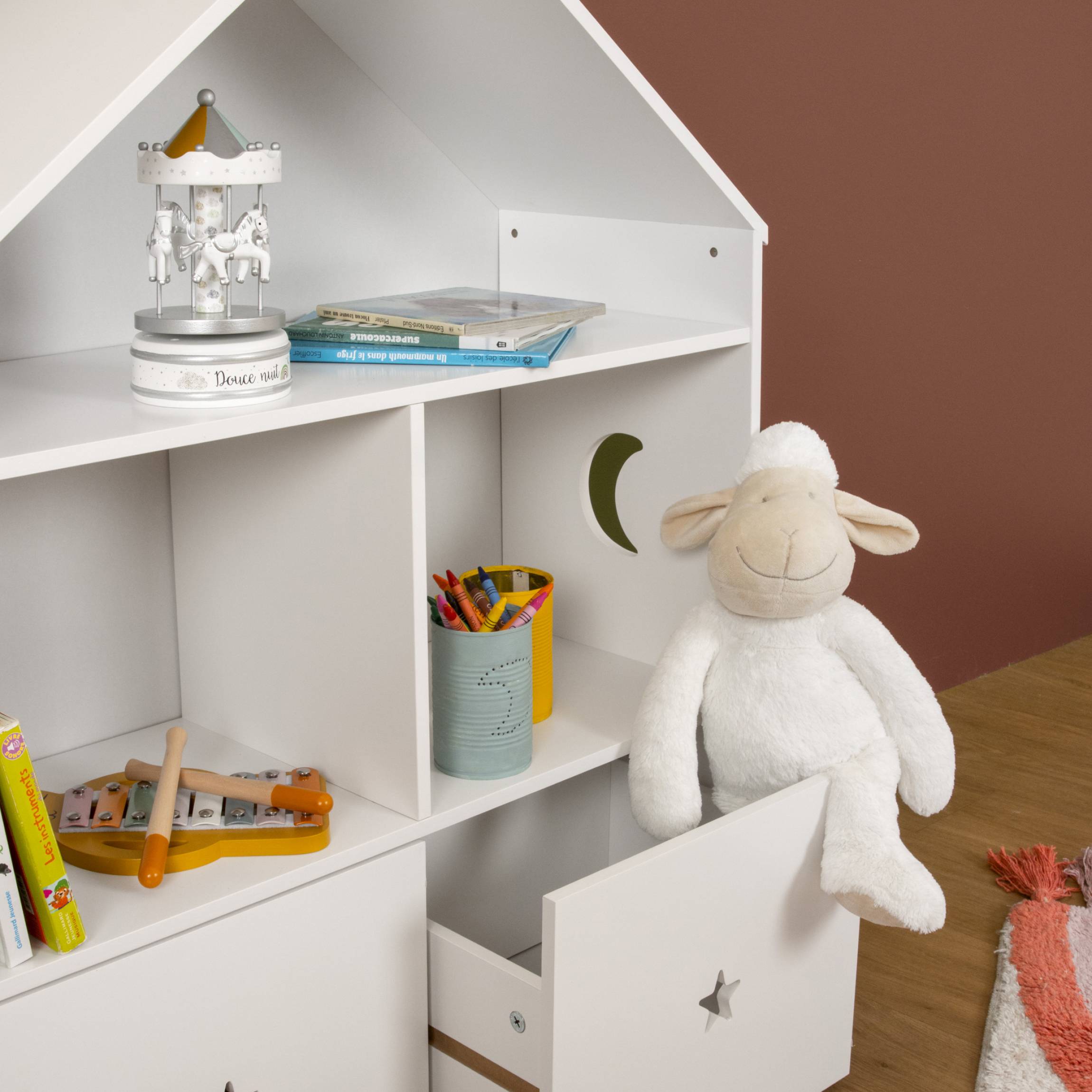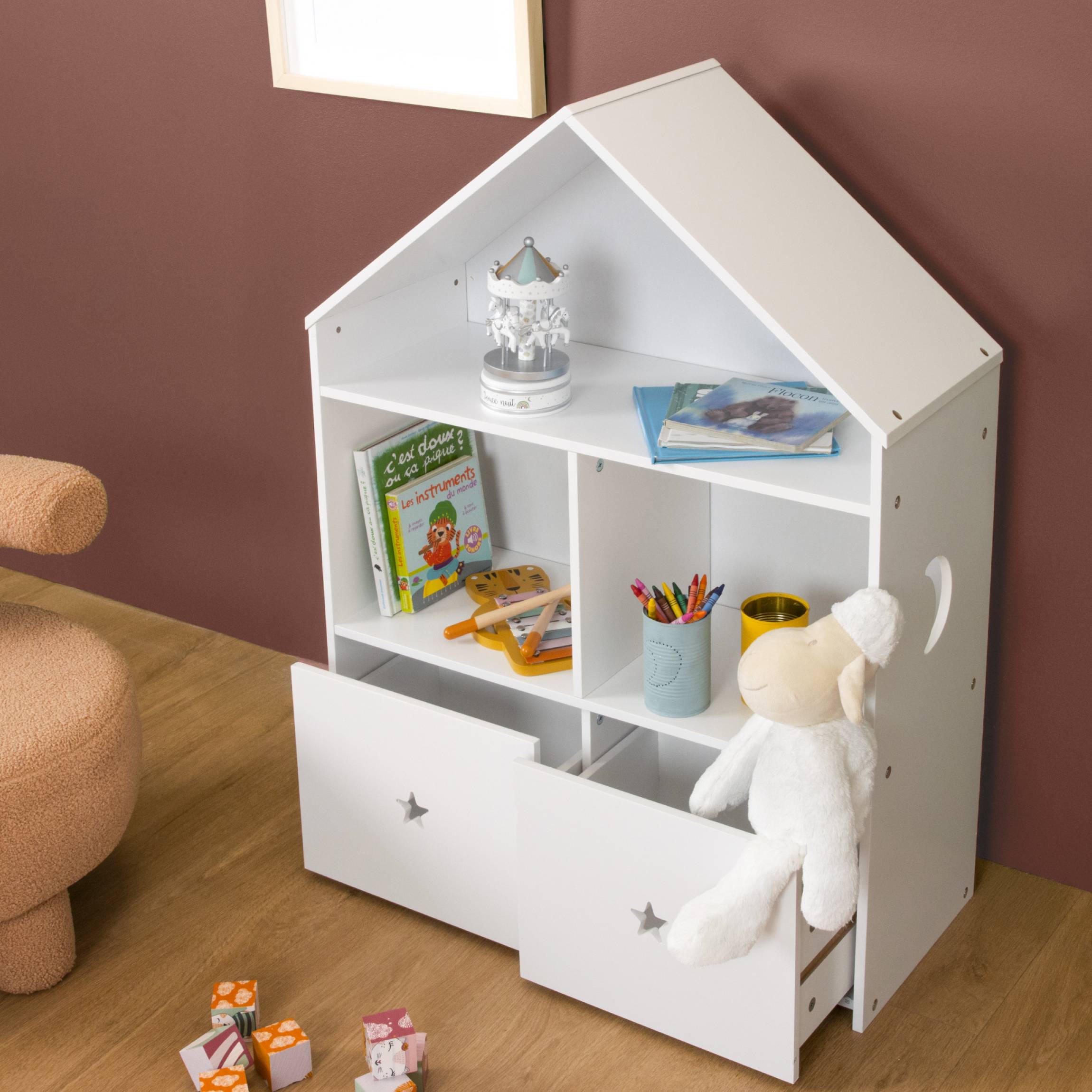 Craquez pour cette jolie petite étagère en bois, de la collection Eminza Kids. Avec ses 3 niveaux et ses 2 coffres, elle organise et décore la chambre de votre petit.