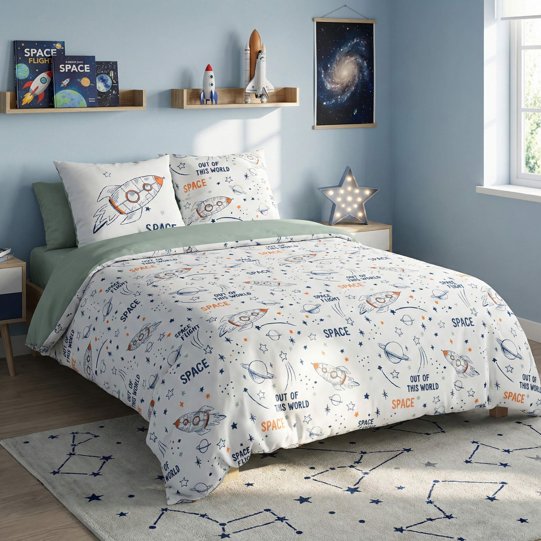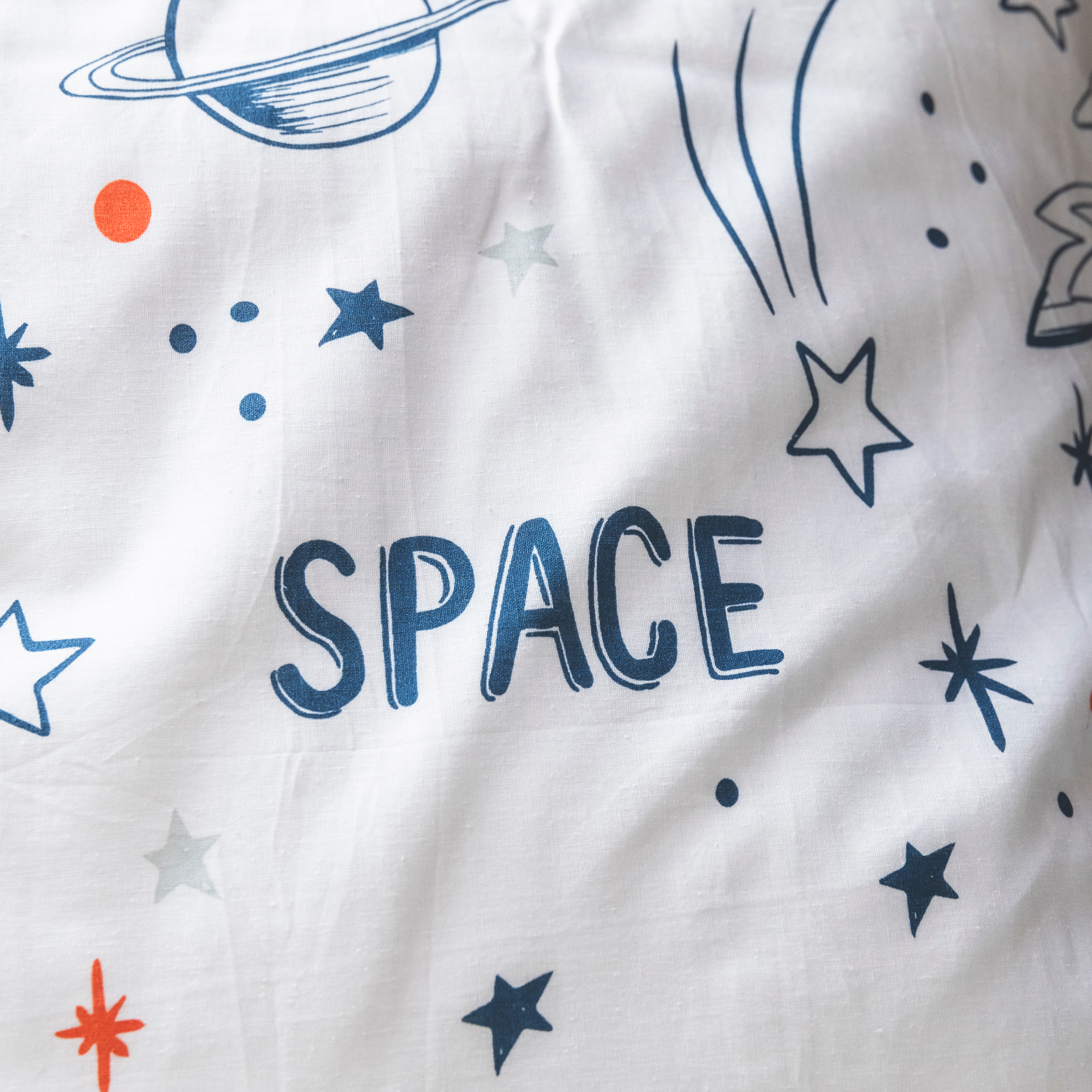 Imprimé : motifs planètes et fusées au recto, uni au verso.