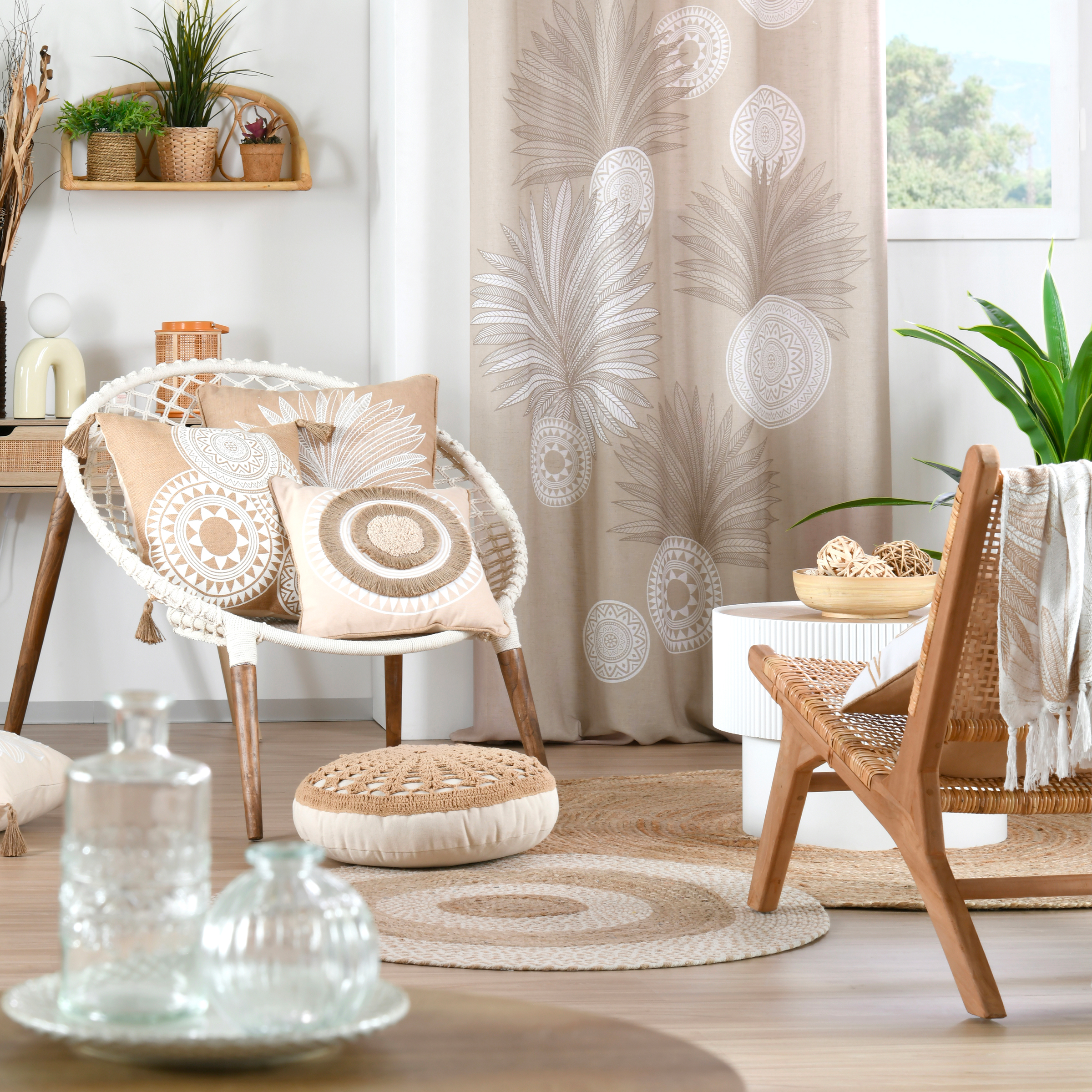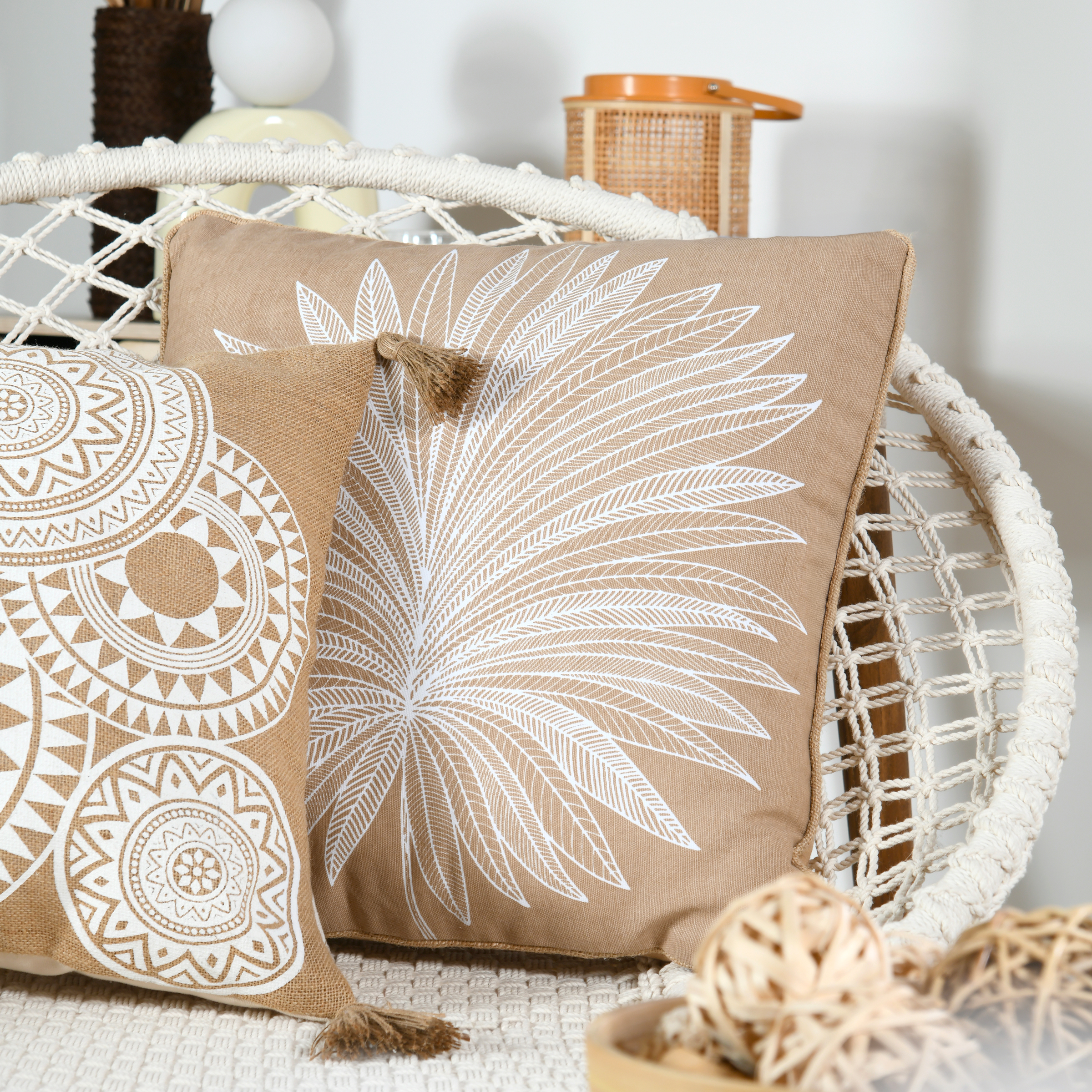 Dimensions : longueur 50 x largeur 50 cm.Matière : 100 % coton (550 gr/m²). Couleur : taupe.Finition : déhoussable avec fermeture à glissière.Imprimé : motif au recto et uni au verso.