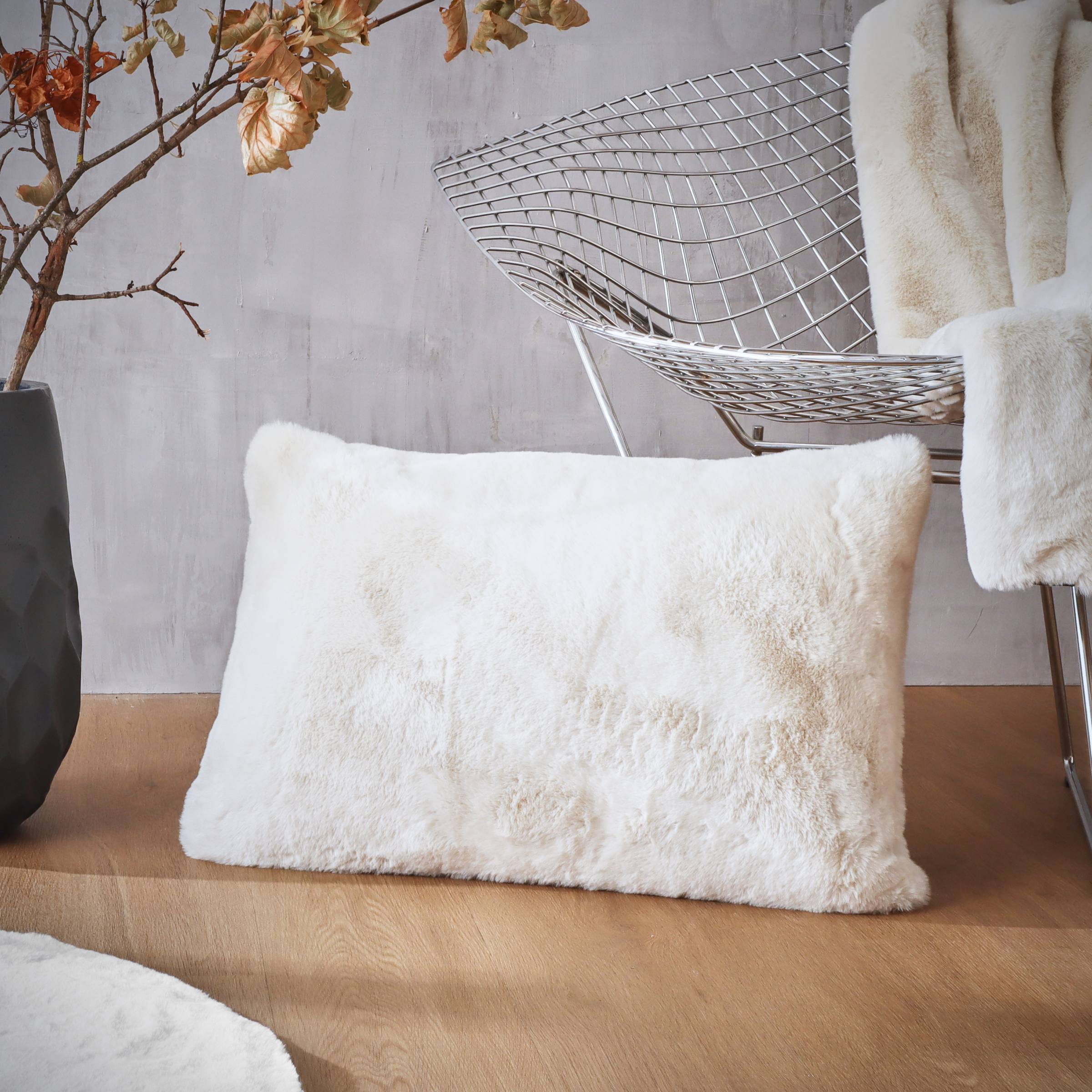 Ce coussin rectangulaire Finn en fausse fourrure blanche vous invite à un moment de détente dans un cocon douillet. Son style évoque l'ambiance chaleureuse d'un chalet de montagne.