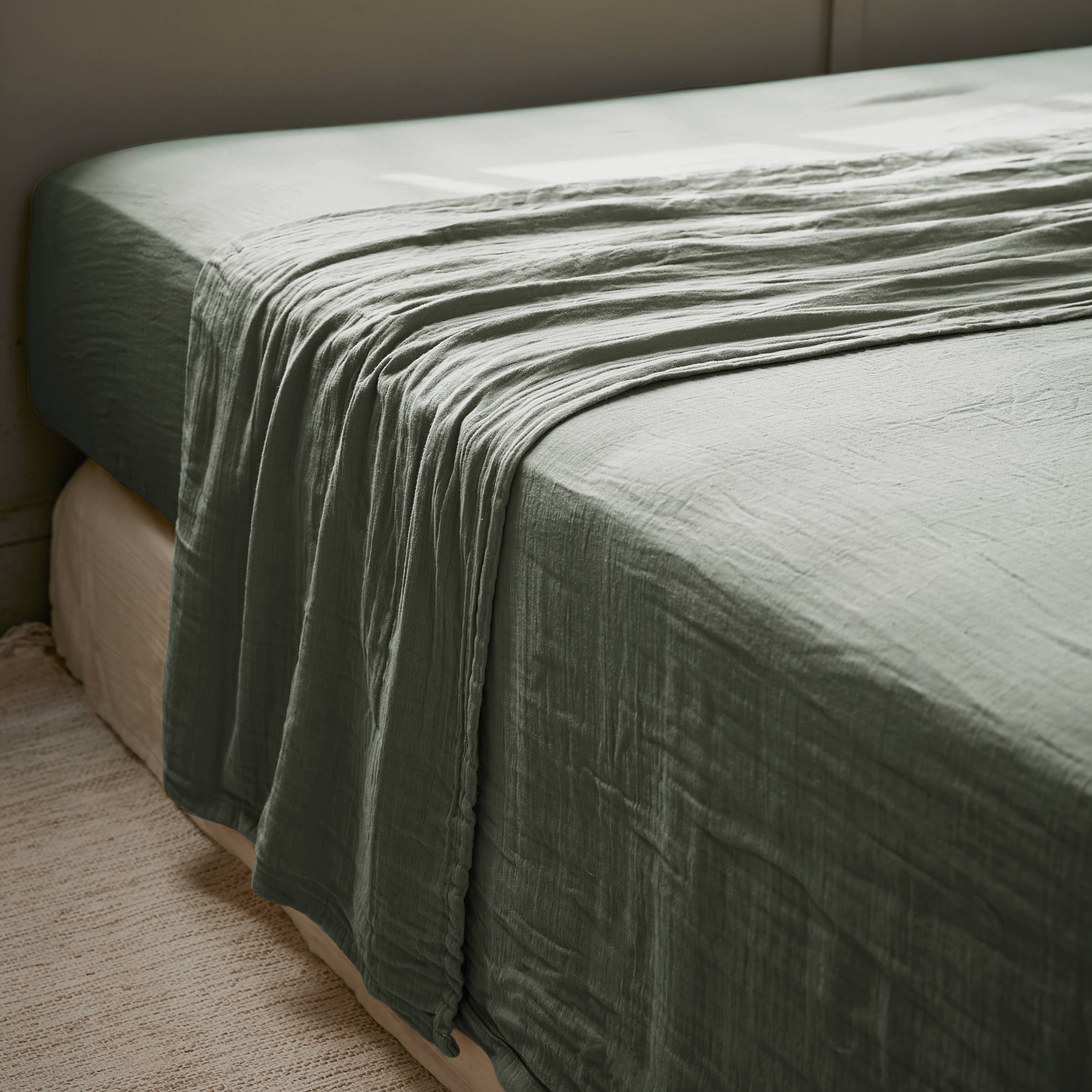Naturellement gaufré, ce drap plat en gaze de coton ne nécessite pas de repassage.