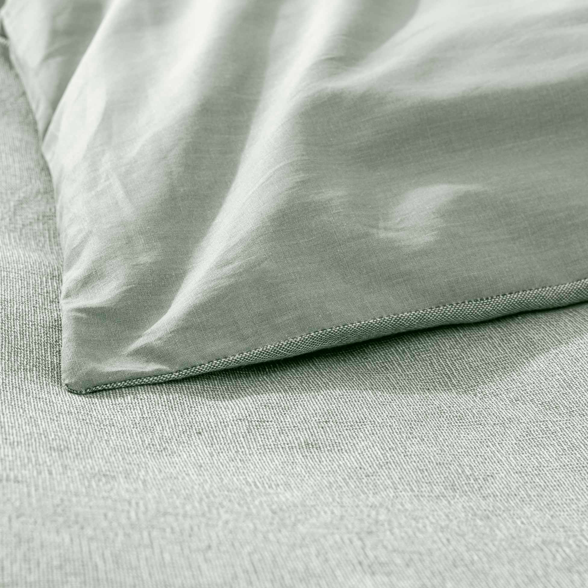 Dimensions : longueur 240 x largeur 220 cm (lit pour 2 personnes). Taies d'oreiller : 63 x 63 cm. Matière : 100 % coton fils teints (60 fils/cm²), une face lisse (110 gr/m²), une face effet tissé (145 gr/m²). Couleur : vert sauge. Finition : boutons pressions.