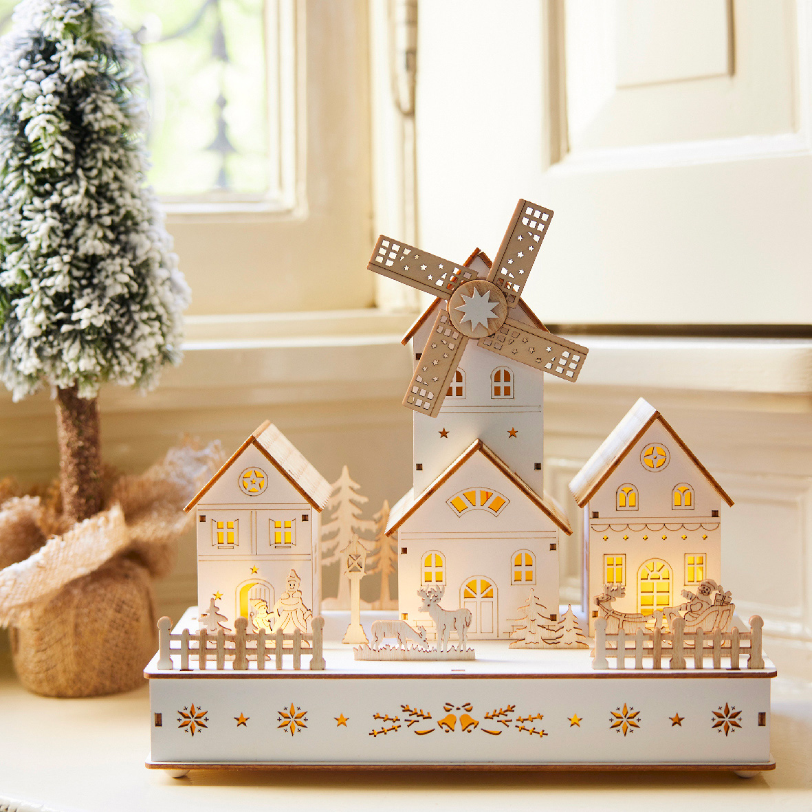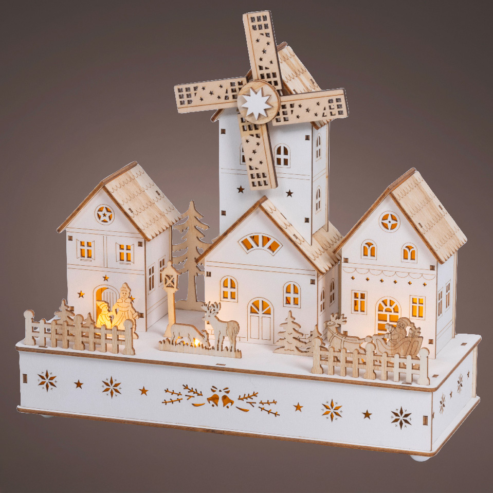 Ce charmant village de Noël en bois, illuminé et animé, apportera une touche chaleureuse et festive à votre intérieur. Son moulin et son hameau, mis en valeur par une douce lumière blanche chaude, créent une scène de Noël idyllique qui ravira petits et grands. Fonctionnant à piles, il peut être placé où vous le souhaitez pour créer une ambiance de Noël magique.