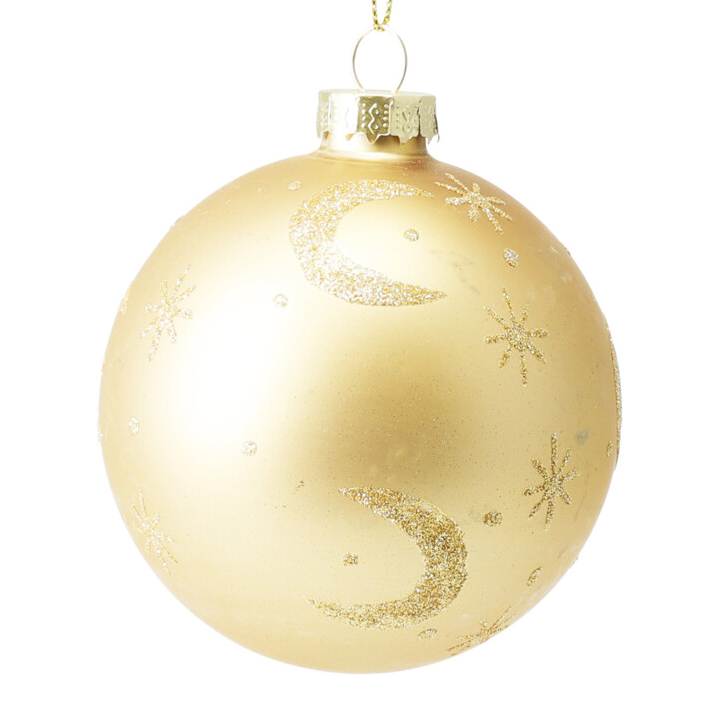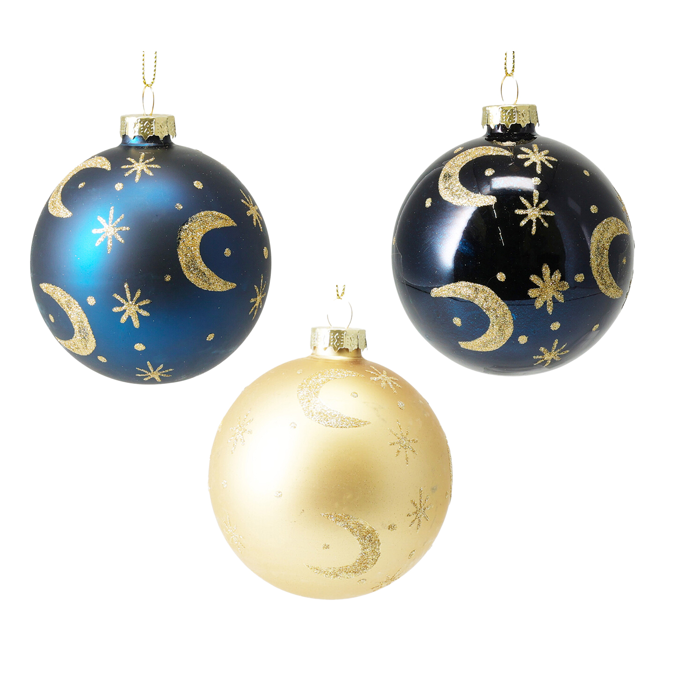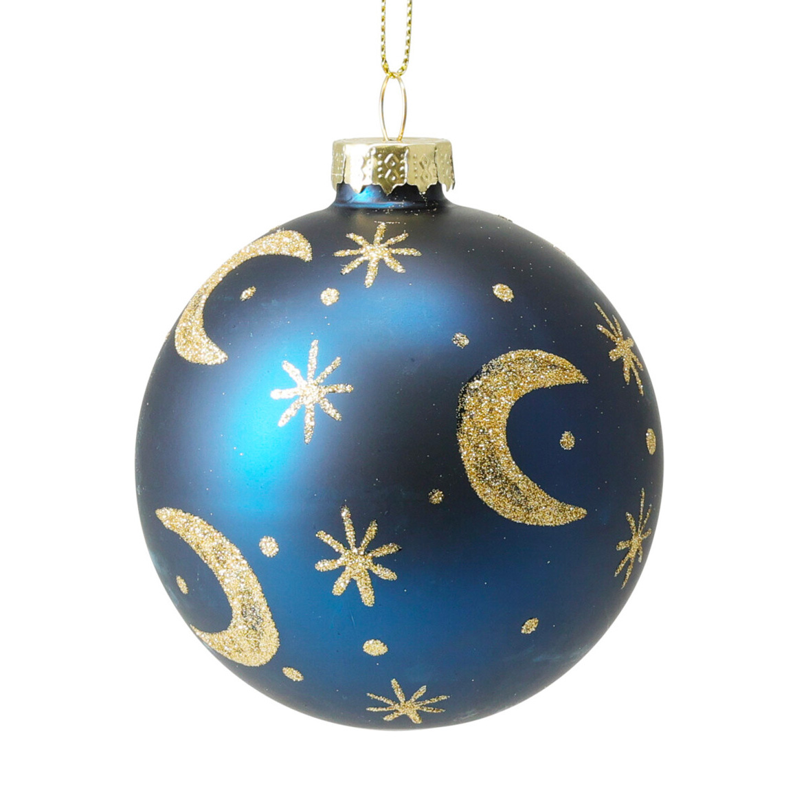 Ces boules de Noël en verre, ornées de motifs de lune et d'étoiles, apporteront une touche de féerie à votre sapin. Leur finition pailletée dorée et leur palette de couleurs bleu et or mat créent une ambiance festive et élégante.