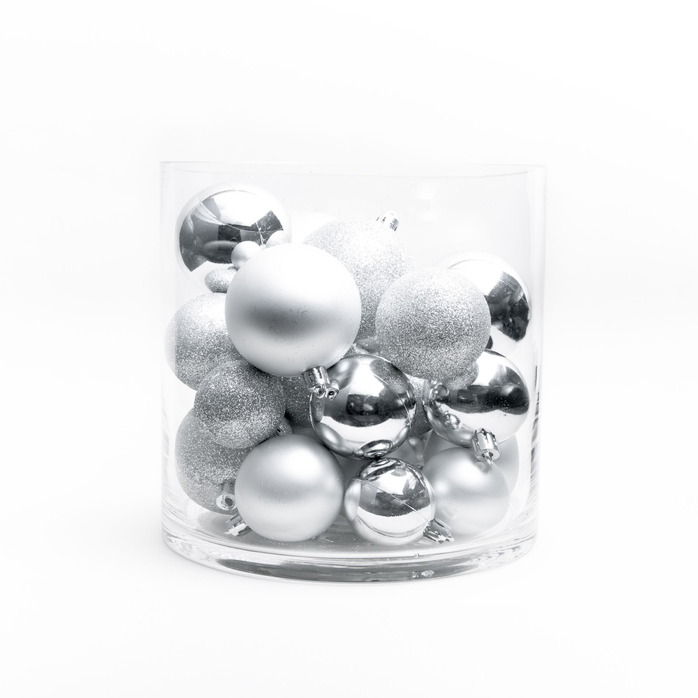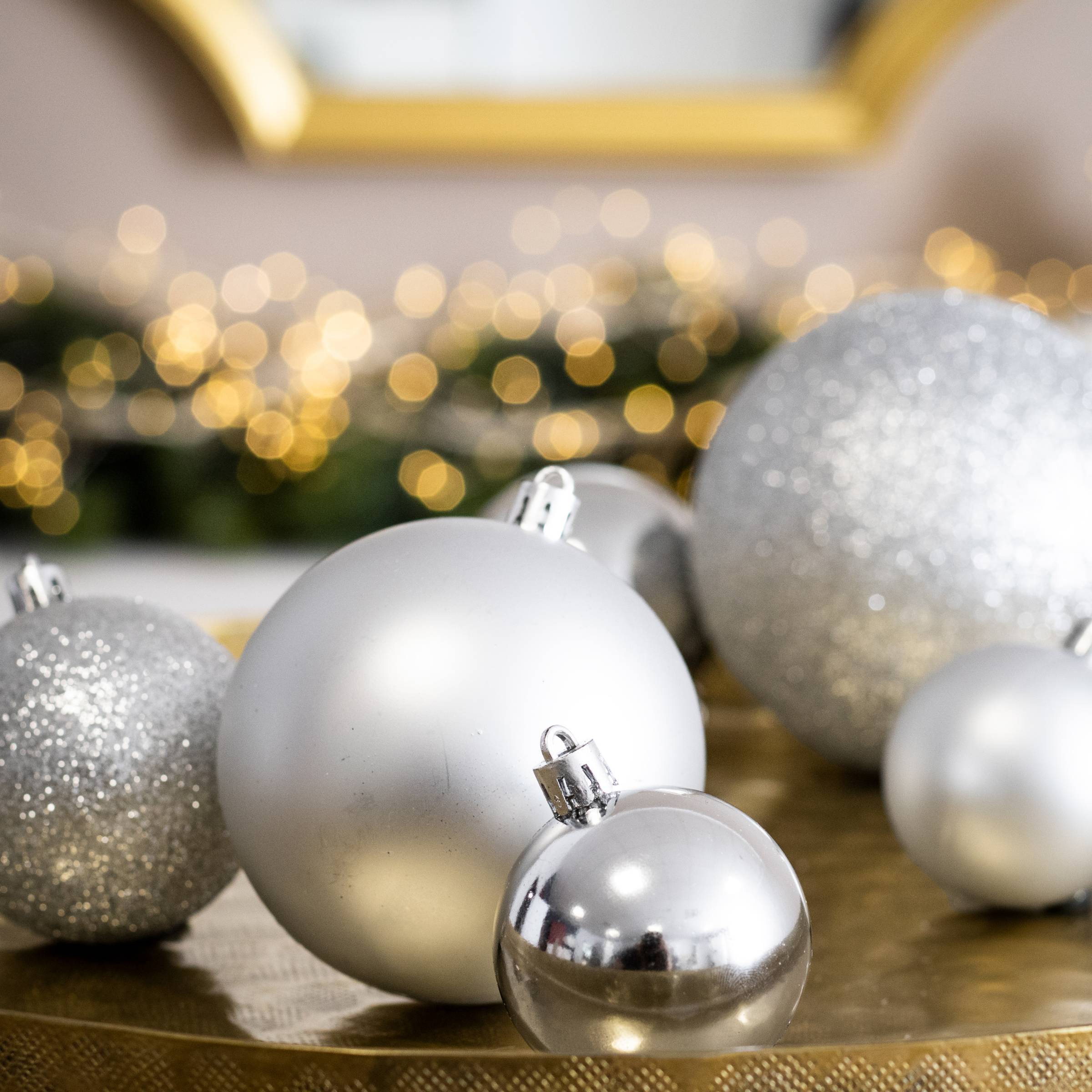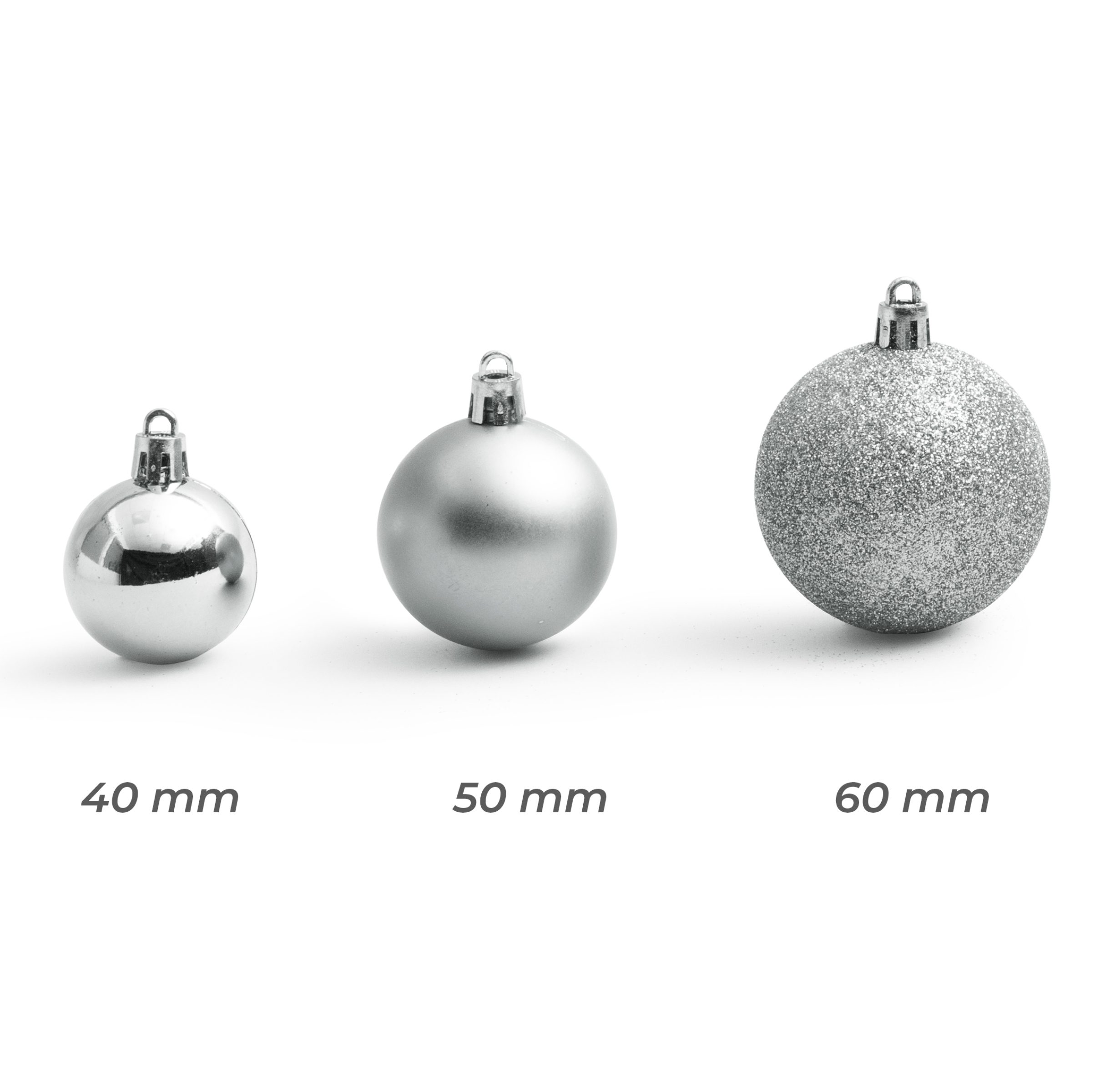 Composition du lot : 10 boules (D40 mm), 10 boules (D50 mm) et 10 boules (D60 mm). Elles sont brillantes, mates ou pailletées.