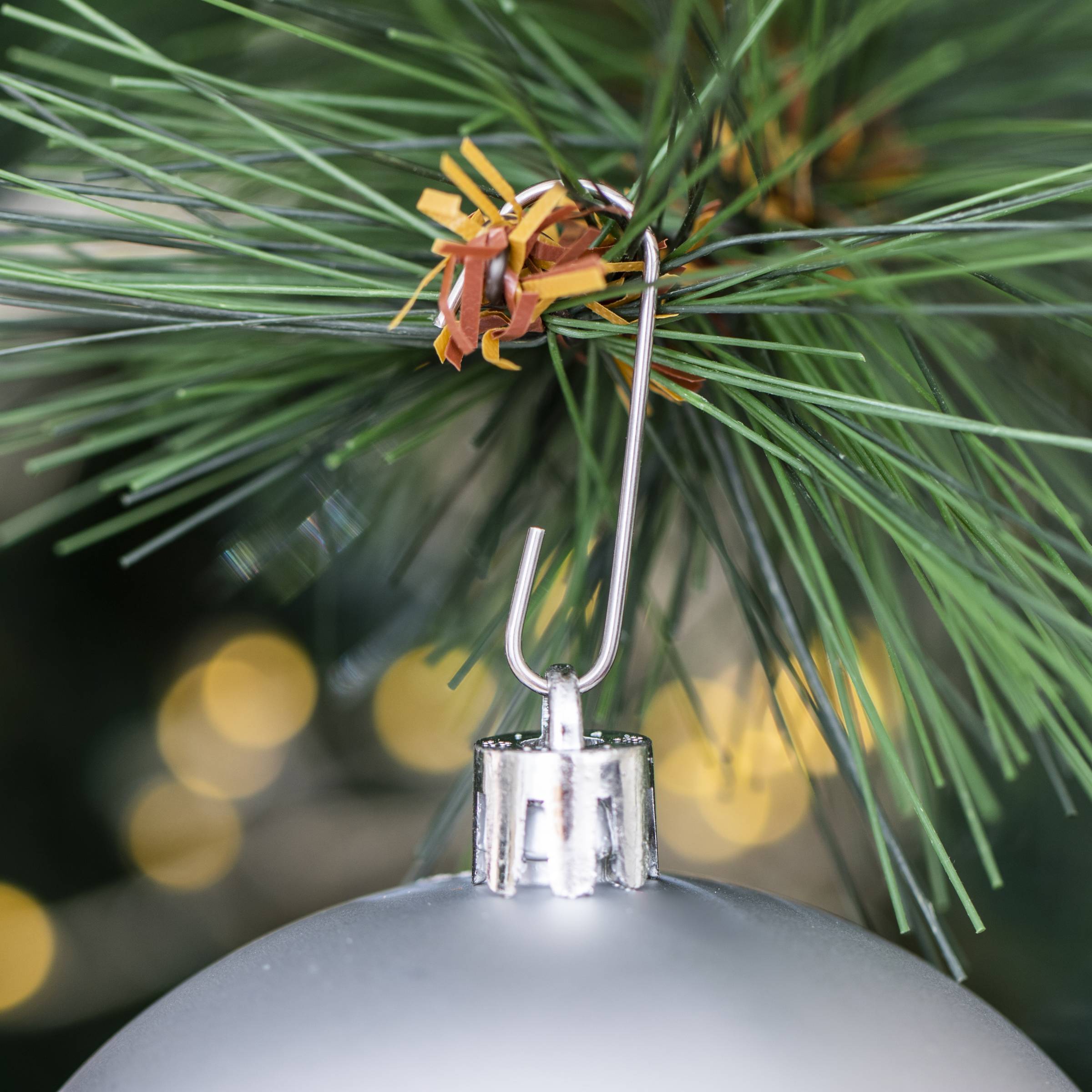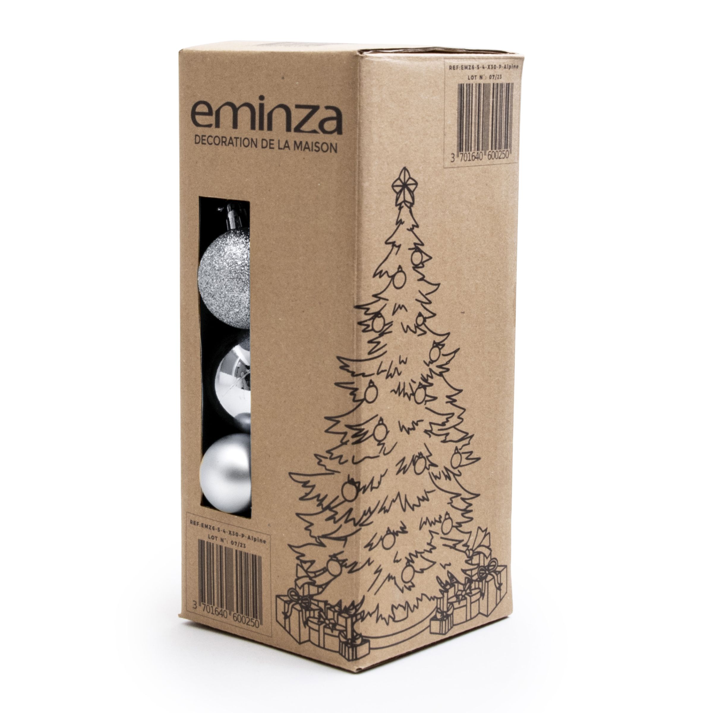 Vendues par 30. Lot composé de 12 boules brillantes (4 de chaque taille) , 9 boules mattes (3 de chaque taille) et 9 boules à paillettes (3 de chaque taille). 30 attaches en métal incluses. Marque Eminza.