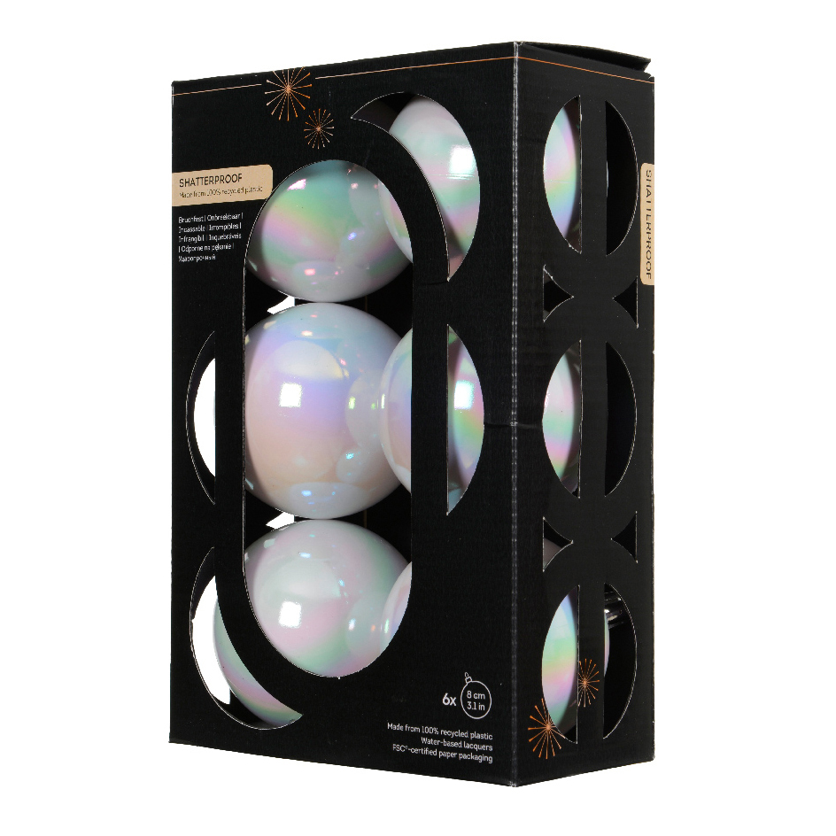 Informations complémentaires : lot de 6 boules, 3 brillantes et 3 mates. Livrées dans un emballage 100% recyclé certifié FSC. Suspension comprise.