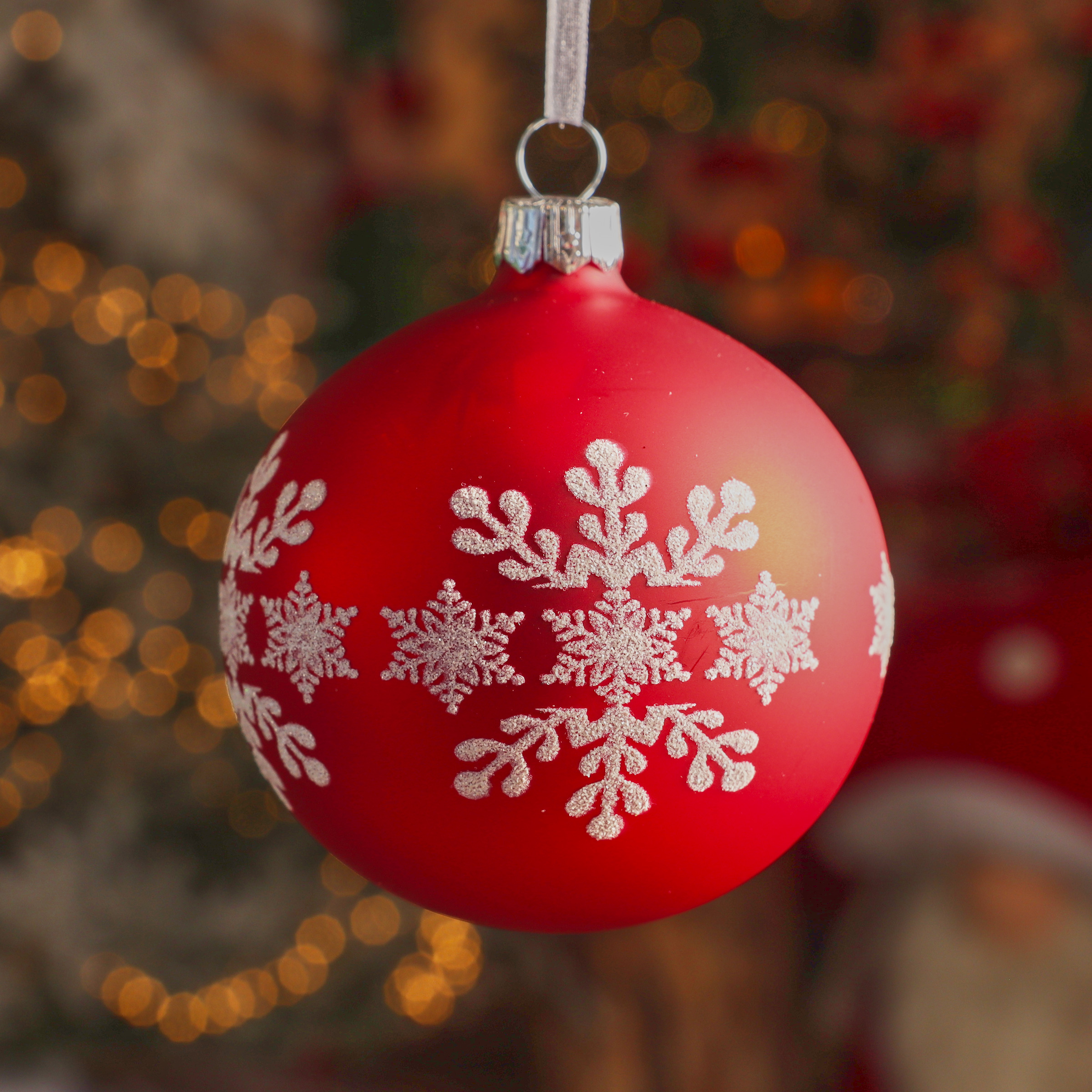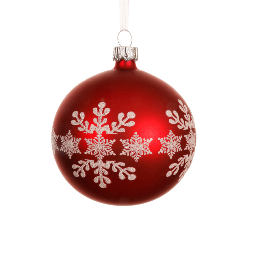 Ces boules de Noël en verre, ornées de flocons de neige floqués blancs, apporteront une touche de féerie à votre décoration de Noël. Leur couleur rouge intense et leur finition mate créent un contraste saisissant avec le blanc pur des flocons, évoquant la magie des fêtes de fin d'année.